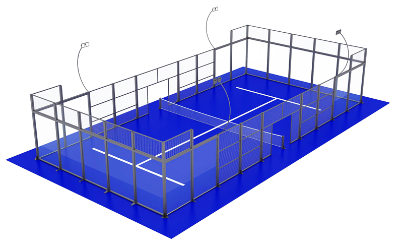 Padel Tennis court: 18 pieces of 12 mm thick G1 tempered glass, 3mm thick hot-dip galvanized steel pipe, 4mm thick hot-dip galvanized mesh, reinforced artificial turf, outdoor waterproof IP65 grade LED lights, 304 stainless steel screws , accessories and links and other components.