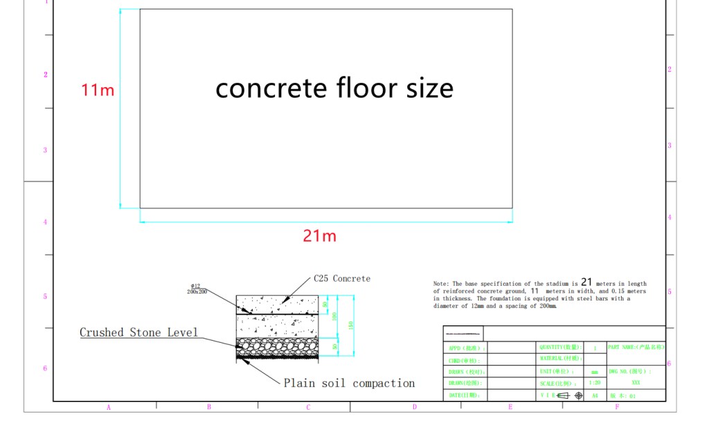 The size of the concrete foundation on the ground of the paddle tennis court: the length is 21 meters, the width is 11 meters, the ground thickness is more than 15 cm, the concrete foundation is equipped with 12 mm per centimeter and steel bars with a spacing of 2 meters.