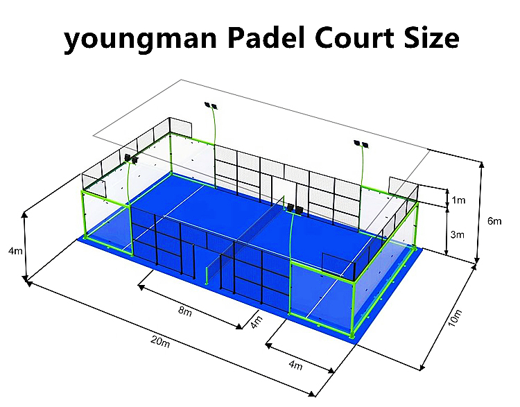 The size of the padel tennis court is Long 20 m* 10 m wide. The heights are 3 meters and 4 meters respectively, and the height of the lamp post is 6 meters. There are 4 goals in the paddle tennis court, and the goals can be disassembled. A nylon net is set in the middle of the court to separate the left and right halves.
